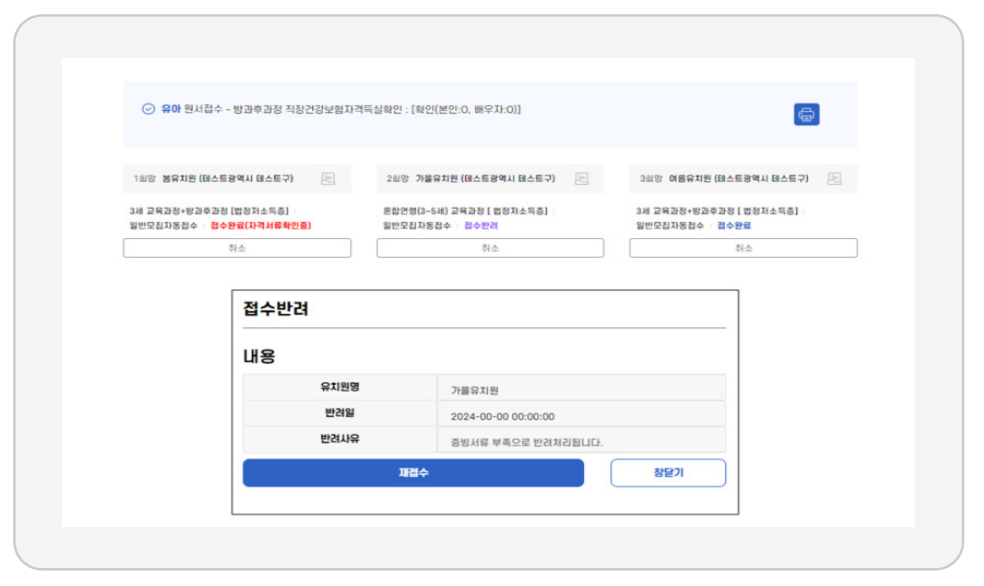 우선모집 원서 접수 후, 접수 결과를 학부모 시스템에서 확인할 수 있습니다. 접수가 반려된 경우, 반려 사유를 확인하고 필요한 증빙서류를 다시 제출하여 재접수할 수 있습니다.