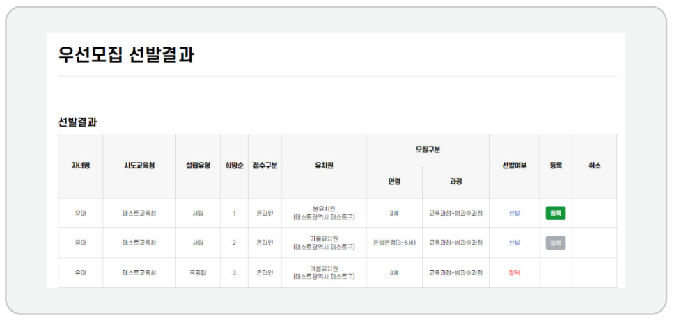 선발 결과는 우선모집 기간 내에 확인할 수 있으며, 선발된 경우 등록을 진행합니다. 등록을 마치지 않으면 자동으로 등록 포기 처리되므로 반드시 기한 내에 등록을 완료해야 합니다.