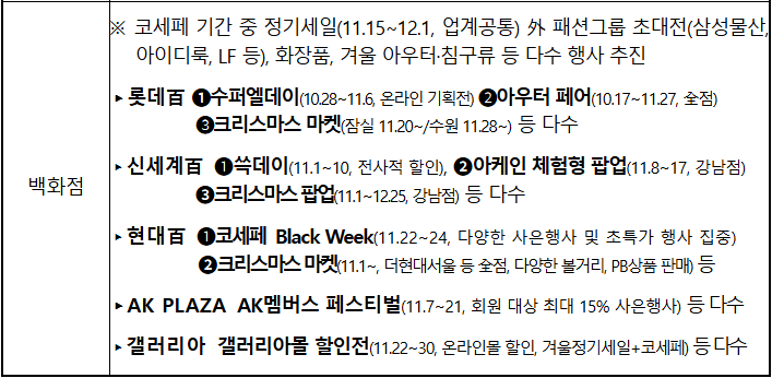 롯데백화점, 신세계백화점 등에서는 겨울 정기세일과 크리스마스 마켓을 통해 생필품을 할인하며, SSG.COM, G마켓 등 주요 온라인 쇼핑몰에서도 특별 할인이 진행됩니다.
