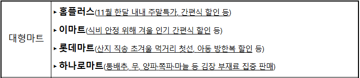 홈플러스, 이마트, 롯데마트 등에서 주방용품과 겨울철 방한용품, 김장 재료 등을 할인합니다. 또한, GS THE FRESH, 롯데슈퍼 등 소형 점포에서도 다양한 생필품을 저렴하게 구매할 수 있습니다.